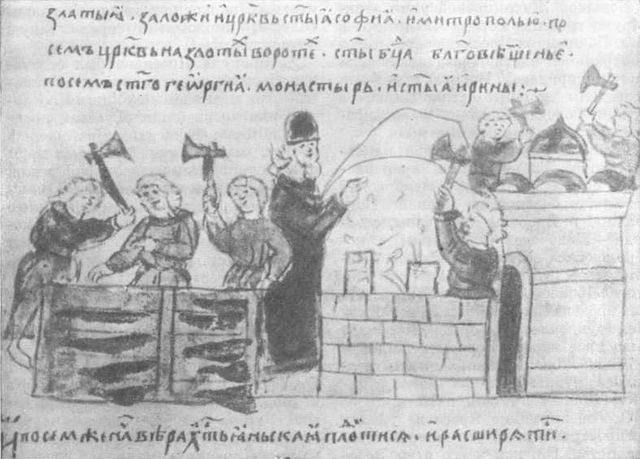 Строительство города Киева. Миниатюра Радзивилловской летописи