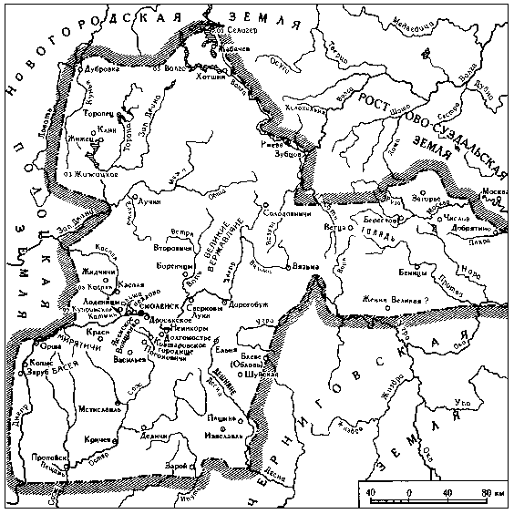 Превращение племенной территории смоленских кривичей в одно из сильнейших княжеств Древней Руси связано с именем второго сына Мстислава Великого, Ростислава. Посаженный отцом в Смоленске около 1125 г., он за десятилетие сумел завершить политическую консолидацию верхнеднепровских земель вокруг этого древнего городского центра[411]. Границы смоленской отчины Ростислава Мстиславича окончательно установились после присоединения земель в междуречье Сожа и Десны (1127) и по реке Протве – так называемая «Ростовская дань» (1134–1135). Политическое значение Смоленской волости целиком определялось ее уникальным географическим расположением – в водоразделе между основными речными артериями Древней Руси: Днепром, Волгой и Западной Двиной, где пересекалось несколько торговых путей. Издавна налаженная здесь система волоков и наличие крупных центров по обслуживанию нужд транзитной торговли позволяли купеческим ладьям перебираться по суше из одного речного бассейна в другой. Пошлины, собираемые с русских и иностранных «гостей», служили основной статьей дохода смоленского князя. Как явствует из жалованной грамоты Ростислава Смоленской епископии, в 1136 г. 35 поселений и областей Смоленской земли платили в княжескую казну больше трех тысяч гривен серебра, и две трети из этой суммы поступало от семи-восьми городов, расположенных у наиболее важных волоков[412].