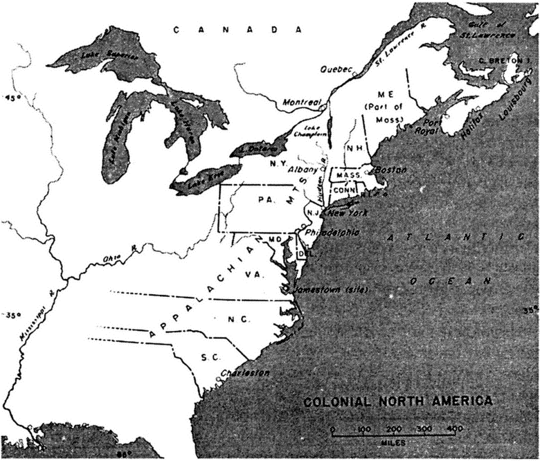 Английские колонии обозначены следующими сокращениями: ME — Мэн (в то время его территория входила в состав Массачусетса); N.H. — Нью-Гемпшир; MASS. — Массачусетс; CONN. — Коннектикут; R.I. — Род-Айленд; N. Y. — Нью-Йорк; РА — Пенсильвания; N.J. — Нью-Джерси; DEL. — Дэлавер; MD. — Мэриленд; VA. — Вирджиния; N. С. — Северная Каролина; S.C. — Южная Каролина.