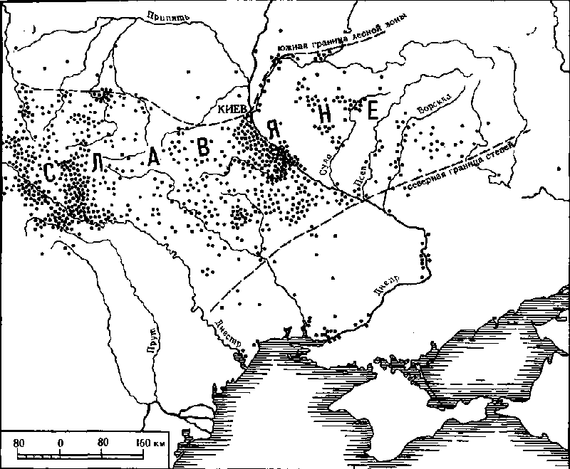 Полнокровное развитие сколотского общества в V–III вв. до н. э., дошедшего, судя по всему известному нам, до уровня государственности, было прервано сарматским нашествием II в. до н. э. Сарматы двигались с востока, от низовий Дона, и в конце концов достигли Среднего Дуная. Они отрезали лесостепных сколотое от степных скифов-кочевинков, ушедших в сердцевину Крыма. В Среднем Поднепровье сарматы уничтожили одно из сколотских царств по Тясмину и сильно потеснили северное царство (киевская археологическая группа), заняв обширное Перепетово Поле на север от р. Роси. Только что зародившаяся праславянская государственность Среднего Поднепровья исчезла примерно на четыре столетия, впредь до сложения новой благоприятной конъюнктуры.