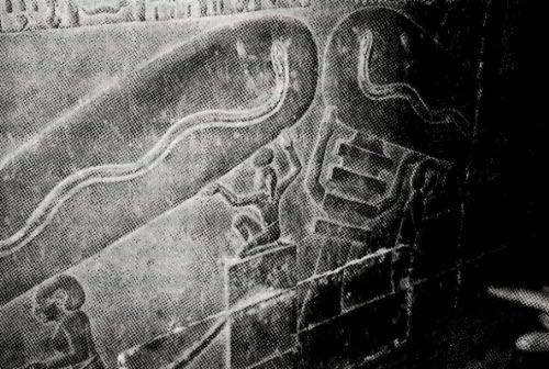 Рис. 73. Дендара. Храм Хатор. Рельефы в нижней крипте храма, возможно, свидетельствуют о том, что древние знали электричество (изображение древних трубок Крукса). 1999 г. Фото автора.