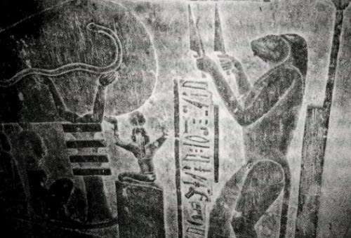 Рис. 74. Дендара. Храм Хатор. На рельефах в нижней крипте показан Скрывший Свое Имя (бабуин, спутник Тота), держащий ножи перед возможными трубками Крукса. 1999 г. Фото автора.