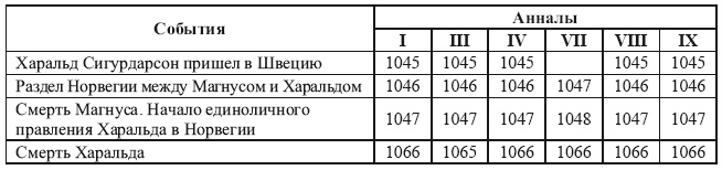 В 1066 г. Харальд сделал попытку покорить Англию, выступив в союзе с ярлом Тости (Тостигом), сыном ярла Гудини (Годвине), против его брата, английского короля Харальда (Харольда) II, сына Гудини. 25 сентября 1066 г. Харальд Суровый Правитель погиб в битве при Стэмфорд Бридже. Об этом сообщает и «Англо-Саксонская хроника»[479]. Снорри Стурлусон так заканчивает рассказ о его жизни: «Харальду конунгу было пятьдесят лет от роду, когда он погиб. У нас нет достойных внимания рассказов о его юности, пока ему не исполнилось пятнадцать лет, когда он был в битве при Стикластадире вместе с Олавом конунгом, своим братом, а после этого он прожил тридцать пять лет. И все это время он жил среди тревог и войн. Харальд конунг никогда не обращался в бегство из боя, но часто прибегал к хитростям, сражаясь с превосходящим противником»[480]. Основные вехи жизни конунга Харальда, согласно анналам[481], приведены в табл. 13.
