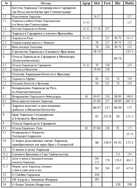 «Сага о Харальде Сигурдарсоне» представлена здесь пятью редакциями, в которых много смысловых и лексических повторов. Тексты публикуются последовательно по редакциям, но комментарий при этом – единый. В содержательном плане «восточная» информация саги распадается на четырнадцать сюжетных мотивов (см. табл. 14). Каждый фрагмент (как в оригинале, так и в переводе) обозначен при публикации вынесенным на поля номером сюжетного мотива, а сводный комментарий ко всем редакциям саги строится по тематическому признаку в соответствии с этими мотивами.