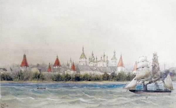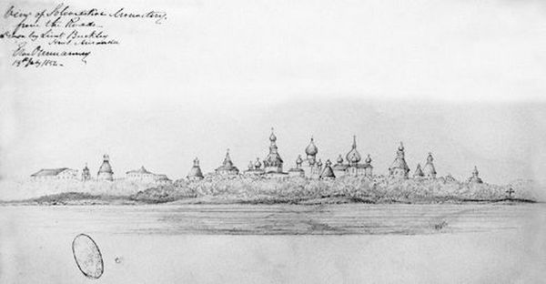 Вид на Соловецкий монастырь со стороны моря. Рисунок лейтенанта Бакли с военного парохода «Миранда». The National Archives, UK. ADM 1/5631.