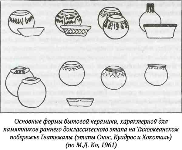 Приведённые выше данные позволяют в предварительном плане поставить вопрос о происхождении керамики в Мезоамерике. Напомню, что самые ранние керамические комплексы на территории этого региона отмечены в долине Техуакана (штат Пуэбла, Мексика), где местный этап Пуррон имеет по С-14 начальную дату 2300 г. до н. э. Столь же солидный возраст демонстрирует и керамика этапа Покс в Пуэрто Маркое на Тихоокеанском побережье штата Герреро (Мексика): дата С-14 2400±140 год до н. э. Кстати, она во многом близка керамическим изделиям с поселений этапа Пуррон в Пуэбле (Техуакан).