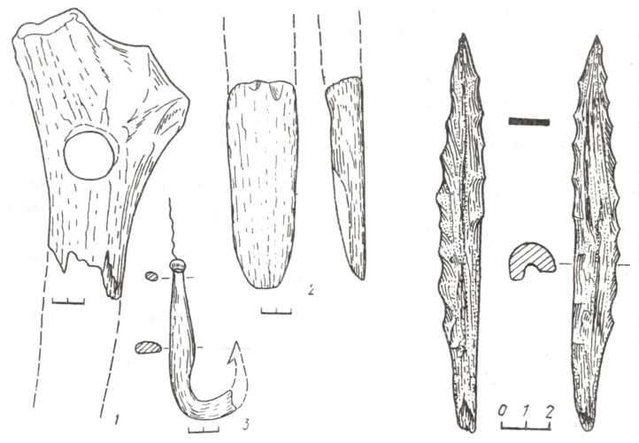 Рис. 110. Обушкова та лезова частини рогових мотик (1, 2) та кістяний гачок (3) для рибної ловлі з Дереївки.