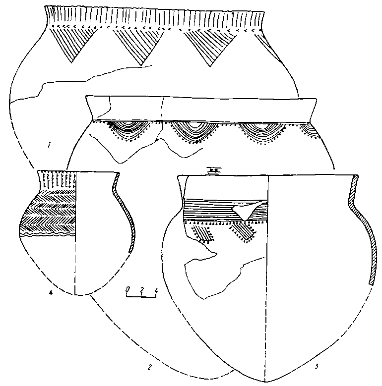 Рис. 113. Глиняний посуд населення скелянської культури: 1—3 — Стрільча Скеля; 4 — Олександрія.