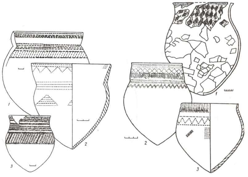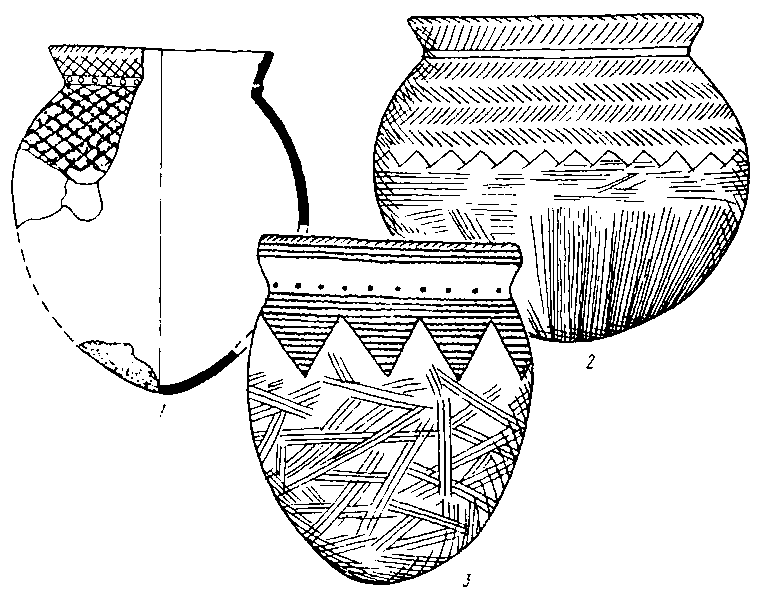 Рис. 114. Типовий посуд населення середньостогівської культури (1 — Середній Стіг; 2 — Хортиця; 3 — Ігрень 8).