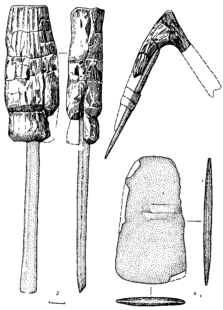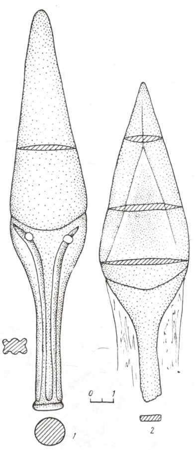Рис. 125. Бронзові знаряддя населення ямної культури — ножі та шило з кістяною ручкою:
