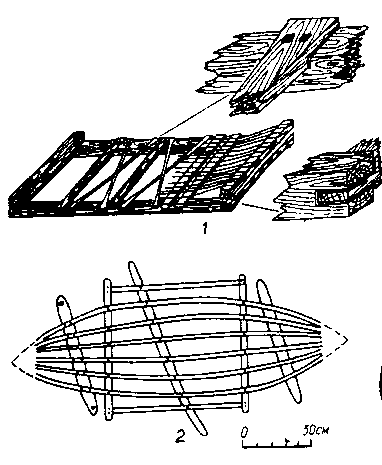 Рис. 121. Реконструкція дерев'яних ложа та носилок із поховань доби ранньої бронзи: