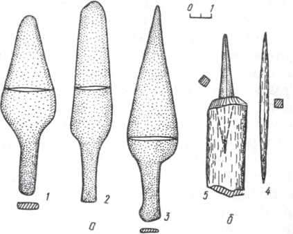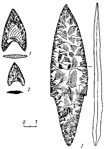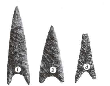 Рис. 123. Крем'яні вістря до стріл та списа з поховань ямної культури: