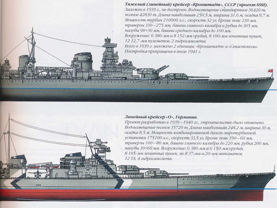 В принципе, проект 69 вел свое происхождение от «малого» линкора типа «Б», разрабатывавшегося в первой половине 30-х годов. Постепенно линкор переименовали в тяжелый крейсер, зато — «самый мощный в мире». В 1939 году на заводах в Ленинграде и Николаеве состоялась спешная закладка двух «сталинских фаворитов» — «Кронштадта» и «Севастополя». По проекту их стандартное водоизмещение составило 35 240 т, а полное — 41 540 т! Вооружение тоже выглядело вполне «линкорным» — его основу составляли девять 305-мм орудий с длиной ствола в 54 калибра, размещенные в трехорудийных башнях. В 1940 году в рамках расширившегося сотрудничества с Германией возникло предложение заменить 305-мм артиллерию на 380-мм немецкую. Проект срочно откорректировали (он получил обозначение 69И); водоизмещение суперкрейсера выросло еще более чем на 1000 т, зато теперь он имел три двухорудийные башни с очень мощными орудиями той же модели, что и на знаменитом «Бисмарке». Но бронирование при этом осталось крайне слабым — самые толстые плиты броневого пояса имели толщину всего 230 мм.