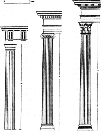 Три типа греческих колонн – три «ордера», как говорят архитекторы: дорический, ионический и коринфский, о котором будет речь дальше. Все масштабы – в «мерках», радиусах колонны. Над дорической колонной – триглифы и метопы, над ионической – сплошной фриз