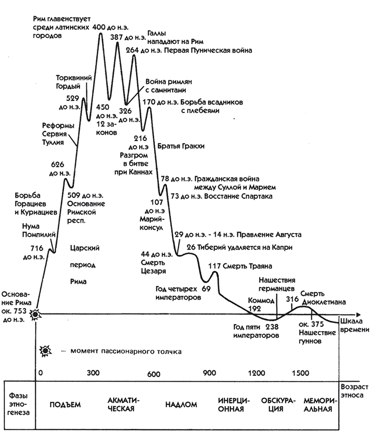 Датировка событий почерпнута О. Г. Новиковой из книг и лекций Л. Н. Гумилева. Указанные даты являются переломными в этнической истории древнеримского суперэтноса.
