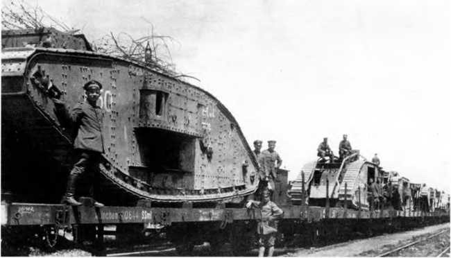 Перевозка по железной дороге «штурмового отделения» трофейных британских танков Mk IV. В составе отделения танки обоих типов — «самцы» и «самки».