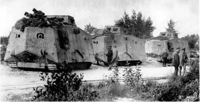 Танки 2-го «штурмового отделения», слева направо: № 504 «Шнук», № 563 «Вотан», № 525 «Зигфрид». Конец июня — начало июля 1918 г. Танки видны с кормовой части. Обратим внимание на дополнительное бронирование рубок и на расположение опознавательных знаков. Маскировочные сети и брезент уложены на крыше, на буксирном крюке танка № 504 подвешена спинка сидения пулеметчика.