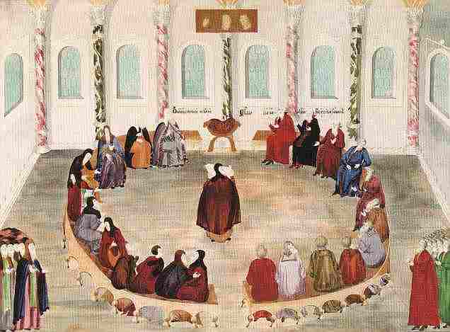 Авраамий Палицын читает в Патриарших палатах Московского Кремля освященному собору, боярам и воеводам челобитие о призвании на царский престол Михаила Федоровича Из альбома «Об избрании на царство великого государя, царя и великого князя Михаила Федоровича, самодержца всероссийского»