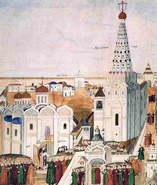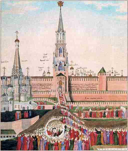 21 февраля 1613 года. На Лобном месте Красной площади стоят архиепископ Рязанский Феодорит со свитком, боярин В. П. Морозов, келарь Авраамий Палицын и другие. Собравшийся народ присягает новоизбранному царю Михаилу Федоровичу Из альбома «Об избрании на царство великого государя, царя и великого князя Михаила Федоровича, самодержца всероссийского»