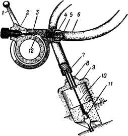 Один конец троса закрепляется в барабанчике 12, приводимом в действие рычагом управления 1, а другой связывается с управляемым механизмом (в данном случае с дроссельным золотником карбюратора), где укрепляется с помощью напаянного наконечника 11. Оболочка троса с одной стороны входит в упор 4, а с другой упирается в регулировочный винт 7, с помощью которого можно несколько изменить длину оболочки и тем самым отрегулировать натяжение троса. Как видно из рисунка, при повороте рычага 1 повернется барабанчик 12, с которым связан конец троса. Трос начнет наматываться на барабанчик и, перемещаясь в оболочке, потянет за собой дроссельный золотник. При отпускании рычага 1 или при повороте его в обратную сторону дроссельный золотник под действием пружины (на рисунке не показана) будет перемещаться в исходное положение.