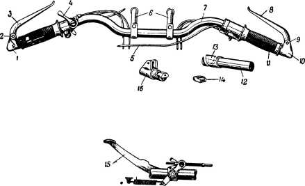 Рис. 141. Руль мотоцикла М-72: 1 и 10 — наконечники руля; 2 и 9 — оси вращения рычагов тормоза и сцепления; 3 — рычаг управления сцепления; 4 — ручка управления зажигания; 5 — трос управления тормозом переднего колеса; 6 — кронштейны крепления руля; 7 — рулевая труба; 8 — рычаг тормоза переднего колеса; 11 — резиновая ручка (правая); 12 — трубка вращающейся ручки; 13 — спиральный паз наконечника трубки вещающейся ручки; 14 — ползун вращающейся ручки; 15 — педаль тормоза; 16 — сухарь крепления наконечника руля.