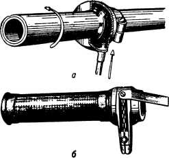 Недостаток ручки этой конструкции заключается в том, что во время работы происходит перегибание троса, наматываемого на блок трубки ручки. Чтобы избежать этого, в ручках иногда выполняется специальная цепочка, которая подвергается перегибу вместо троса. Цепочка наматывается на блок, а трос, как и в ручках ползункового типа, движется прямолинейно. Одна из таких конструкций приведена на рис. 142, б.