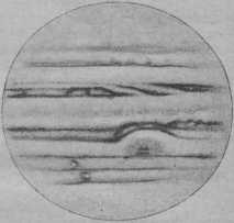 Поэтому в телескоп мы видим на Юпитере параллельные линии и полосы, образуемые грядами облаков, гонимых пассатными ветрами. Таким образом, в еще значительно большей мере, чем на Земле, там, при быстром вращении этой исполинской планеты, слои воздуха отстают от находящихся под ними твердых частей поверхности. Было замечено, что это «красное пятно» с годами медленно отставало от остальных видимых нам образований: оно имело как бы обратное движение на поверхности планеты. В целом, совокупность этих явлений на Юпитере можно истолковать только тем, что под слоями его облаков, которые одни лишь видны нам, Юпитер обладает еще тонкой, твердой корой, которая прорвалась на месте красного пятна; оттуда вырвалась огненно-жидкая магма, и поэтому находящиеся над ней облака получили красный оттенок. Этот прорыв твердой коры случился не сразу на всей площади, и мы можем себе представить, по примеру Земли, что этот геологический процесс погружения большой площади коры происходил постепенно, хотя и в течение немногих лет. При этом, подобно атмосферным массам, вытекающая магма была оттесняема в направлении, противоположном вращению планеты, но только значительно медленнее, чем слои воздуха.