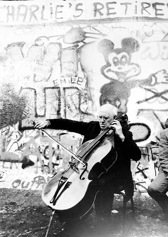 Ростропович играет Баха перед Стеной: обратите внимание на граффити «Чарли вышел на пенсию». Ребята с баллончиками краски времени даром не теряют!