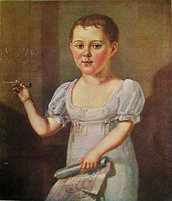 Между прочим, Лермонтов был ещё и талантливым художником. Писать стихи он начал только в четырнадцать, а вот рисовать — в раннем детстве. Пол его комнаты в Тарханах был покрыт зелёным сукном, на котором маленький Мишель, не умеющий ещё даже ходить, с огромным удовольствием рисовал мелом. Именно так, с мелком в руке, изображён Лермонтов–ребёнок на картине неизвестного художника.