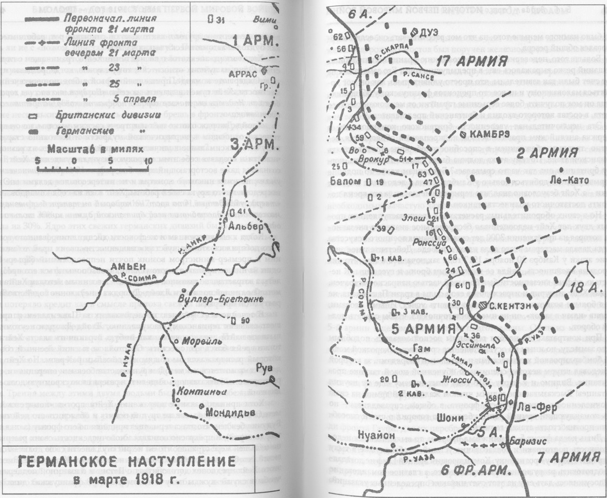Ни один из эпизодов войны не вызвал столько вопросов, как тот, занавес над которым поднялся 21 марта 1918 года. Почему, когда союзники в течение двух лет войны вели атаки, обладая явным превосходством сил — они внезапно очутились в таком отчаянном положении, сражаясь чуть ли не с «ножом, приставленным к горлу?». Почему, после того как общество заверили, что обеспечено взаимодействие между союзниками и не нужен общий главнокомандующий, — теперь такой главнокомандующий срочно понадобился и был назначен? Почему, когда союзники в течение двух лет не прекращавшихся наступлений могли оказать лишь малозаметное воздействие на фронт германцев — германцы смогли в течение нескольких дней прорвать широкую брешь в фронте союзников? Почему, если прорыв этот, далеко превзойдя цели по своим размерам, о которых только могли мечтать союзники, организуя подобные же удары, не смог все же привести к решающим результатам?
