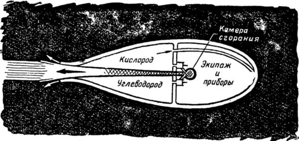 Ракета Циолковского похожа на каплю дождя. В носовой части корабля размещаются экипаж и приборы. Вся другая часть занята под топливохранилище. Половину этого хранилища занимает само топливо, а половину — жидкий кислород. Постепенно, порция за порцией, подаются топливо и кислород в камеру сгорания. Здесь поддерживается всё время горение, и нагретые до высокой температуры газы с огромной скоростью вылетают наружу, создавая силу реакции и заставляя ракетоплан тоже с большой скоростью нестись вперед.
