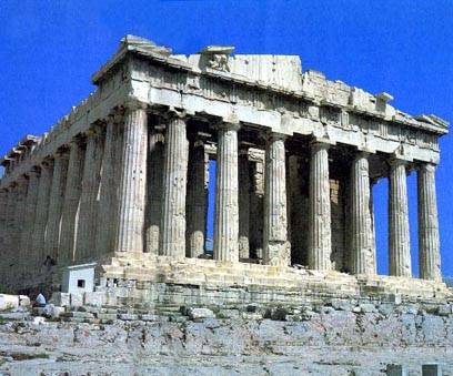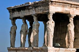 Кариатиды – вовсе не развитие идеи колонны. Кариатиды лишь развивают идею облика божества. Упрощенная форма кумира – просто столб, который лишь позднее снабжается антропоморфными элементами, а потом превращается в человеческую фигуру. Каннелюры (вертикальные ложбинки) на колонне – вовсе не абстрактная эстетика с целью создать иллюзию удлинения колонны. Это ровно ниспадающие складки одежды. Такие складки можно видеть на ранних греческих скульптурах столпообразного типа.