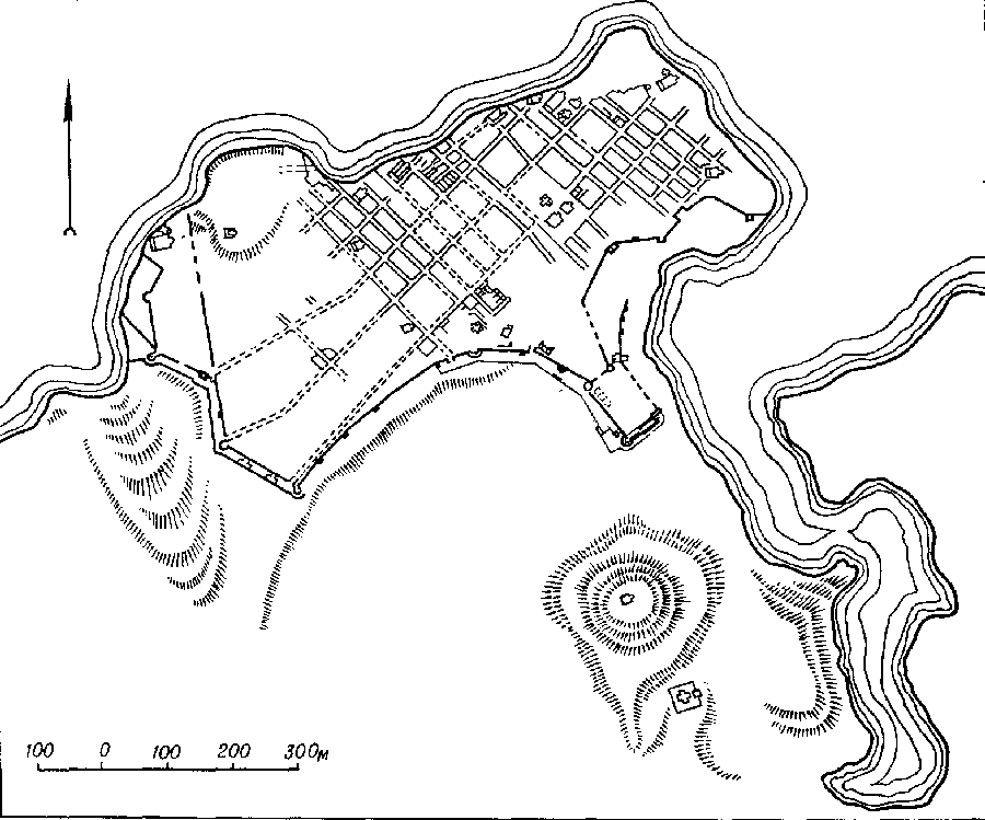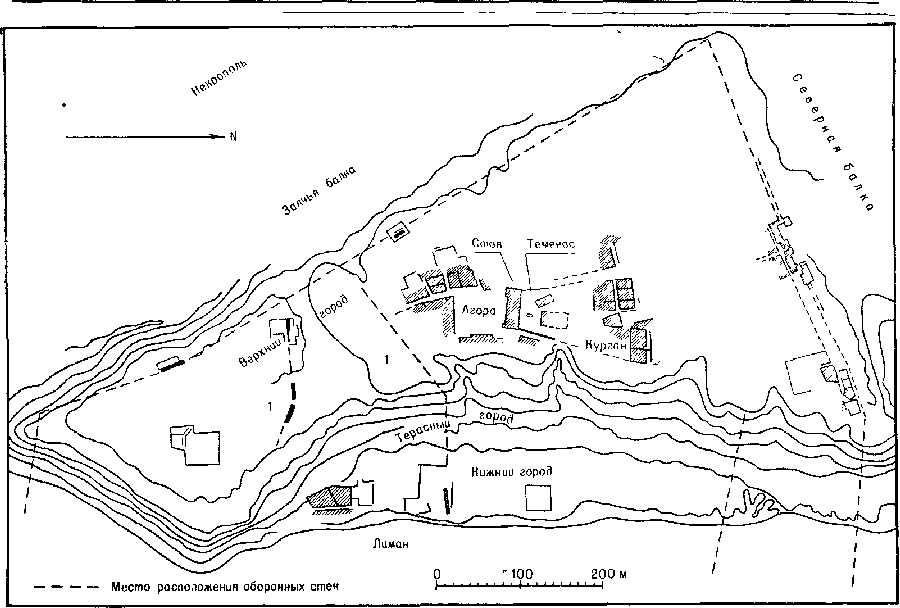 План Ольвии эллинистического времени: 1 — размещение северных стен цитадели в первые века нашей эры