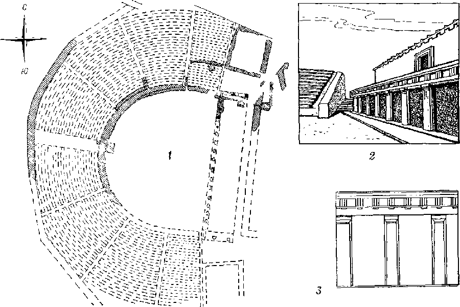 Херсонесский театр: 1 — план; 2 — общий вид проскения и скены; 3 — часть фасада проскения. Реконструкция О. И. Домбровского