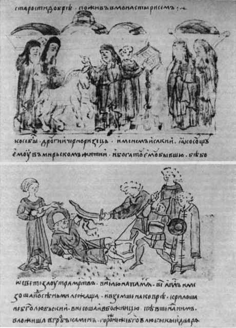 Наверху — рисунок-памфлет у изображающий игумена Никона в виде осла. 1074 г. Внизу — убийство Андрея Боголюбского. 1174 г. Отрубленную руку князя держит его жена, не упомянутая в тексте данной летописи.