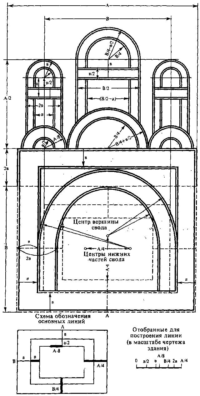 Чертеж церковного здания из «Изборника» 1073 г. Внизу — геометрический график «вавилон», облегчавший русским зодчим построение архитектурных форм