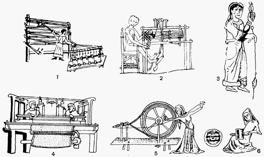1 – навивание основы; 2 – ткацкий станок; 3 – ручная прялка; 4 – ткацкий станок для двух рабочих; 5 – прядильное колесо, прочесывание шерсти; 6 – кордование шерсти. [135]