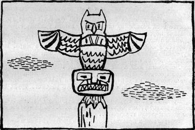 Каменными топорами мужчины раскалывали толстые бревна на доски. Работа подвигалась медленно. Но вот уже на толстых, врытых в землю столбах, поддерживающих двускатную крышу и портал, искусно вырезаны изображения тотема рода Орлиных Когтей. В тот день, когда перед готовым домом был врыт высокий тотемный столб с резьбой, изображавшей орлиные и волчьи головы, птичьи крылья, лапы, воины хозяина в полном боевом облачении напали на строителей...