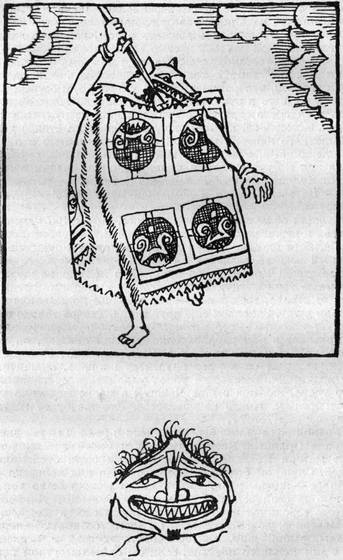 Когда начнутся танцы вокруг костра, под пение женщин рода, в ряды танцующих войдет человек, одетый в точно такой же костюм, какой был на умершем, — тогда все будут считать, что дух умершего доволен принесенной жертвой. В руках танцующих будут острые кинжалы с двойными лезвиями, которыми они ради забавы будут колоть и закалывать рабов, чтобы освятить поминки кровью. Человек в маске умершего пройдет круг вместе со всеми, а потом останется один у костра, чтобы продолжать танец. Все остальные сядут вокруг.