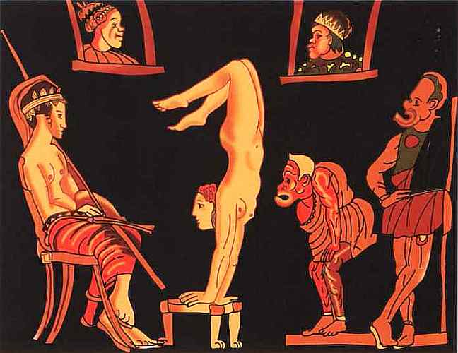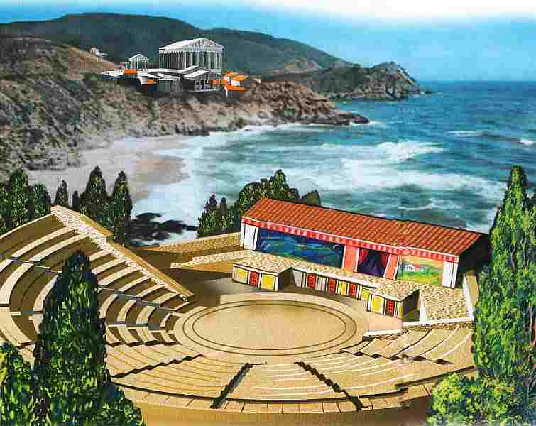 Греческий театр (то есть место для представлений) строился в котловине между холмами (благо Греция страна гористая, и холмов там хватает) и представлял собой открытое конусовидное сооружение, в центре которого находился орхестр — так именовалась круглая площадка для хора; чуть выше орхестра располагалась сцена. Благодаря такой архитектуре акустика в театре была великолепная, и любой из зрителей слышал все реплики актеров, а ведь греческие театры были, по нынешним меркам, огромны и вмещали по нескольку тысяч человек. Актеры (а актерами были только мужчины, игравшие и женские роли) всегда исполняли свои роли в масках, которые отвечали характеру персонажей. Были трагические маски, были комические.
