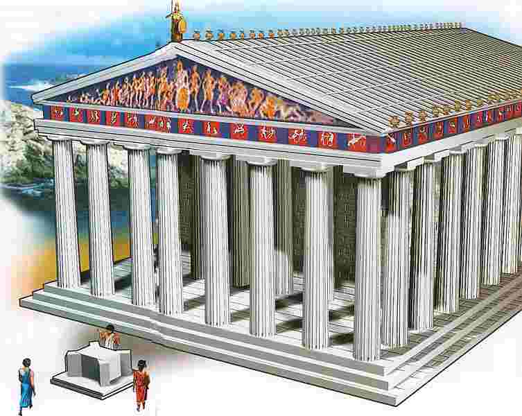 В фасаде древнегреческого храма Парфенон обнаружены пропорции золотого сечения, а в ходе раскопок рядом с храмом были найдены циркули, с помощью которых древние архитекторы и скульпторы внедряли золотую пропорцию в свои творения. Парфенон — это храм в Афинах, посвященный богине Афине. Он был построен на скале, вознесшейся на высоту около 150 м над уровнем моря, и был виден не только из любой части города, но и с подплывающих к Афинам судов. Архитекторы окружили храм колоннадой из 46 колонн, а за колоннами по стене здания был выполнен рельефный фриз (так называется орнамент на стене здания), в создании которого участвовал целый коллектив мастеров, под руководством выдающегося скульптора древности Фидия, родившегося в начале V века до н. э. Ему принадлежат грандиозные статуи Афины Промахос на Акрополе в Афинах и Афины Парфенос. Статуи были выполнены из золота и слоновой кости.