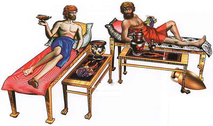 Если греческий мужчина большую часть дня проводил вне дома, то уделом женщин было домоседство. Женщина в греческом доме — работница (правда, самые тяжелые работы выполняли рабы и рабыни). Она и прялка, она и повариха. Когда мужчина вечером возвращался домой, он мог привести с собой друзей. Веселая компания располагалась в специально отведенной для этого комнате, где стояли особые кушетки, поскольку угощались в те времена и вели философские споры в горизонтальном положении — возлежа. Назывались такие собрания симпосиями (современное слово симпозиум пошло оттуда, хотя оно к веселому собранию с вином не имеет никакого отношения).