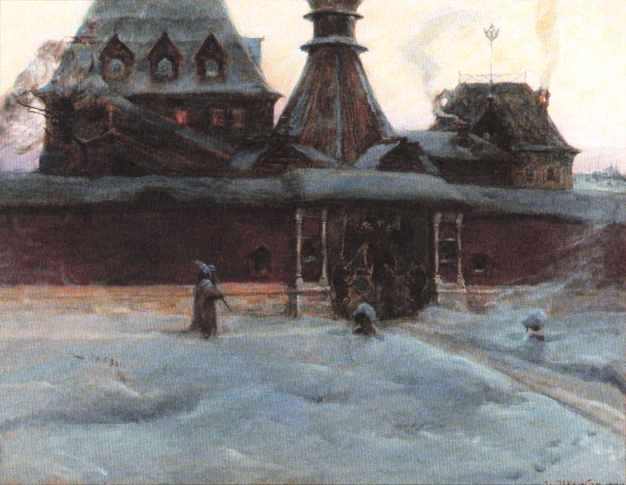Странная затея между прочим пришла ему в голову: задумал он обратить свой дворец в монастырь, выбрал из опричников 300 самых лихих, назвал их иноками, себя игуменом, князя Вяземского келарем, Малюту пономарем. Поверх своих блестящих кафтанов они надевали черные монашеские рясы, на головы скуфейки, или тафьи. Рано утром, в четвертом часу, царь ходил с царевичами и Малютою на колокольню и благовестил. Опричники-иноки под страхом наказания спешили к заутрене. Служба длилась до 6 или 7 часов. Царь в церкви сам пел, читал, молился и так усердно бил поклоны, что на лбу его оставались часто синяки. В 8 часов начиналась обедня; в 10 часов садились за братскую трапезу, за которой братия пила, ела досыта: всякого яства, вина и меду было вдоволь. Во время трапезы царь стоя читал вслух из поучительных книг или Библии, обедал сам он позже. Во время обеда любил беседовать со своими приближенными о вере и выказывал при этом очень большую начитанность и память. После обеда дремал или отправлялся в темницу смотреть на пытки; казалось, они забавляли его; нередко он возвращался с пыток веселым, разговорчивым, шутил. В 8 часов шли к вечерне, затем в десятом часу царь удалялся в свою спальню; здесь три слепца-сказочника по очереди рассказывали ему сказки, пока он не засыпал. Вскоре после полуночи он просыпался и начинал день молитвою…