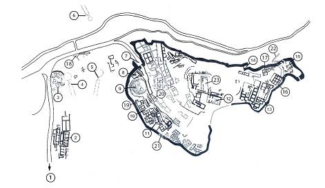 1. К "сокровищнице Атрея", толос 1250 г. до н.э., 2. Комплекс зданий с Домом торговца маслом, 3. Могильный круг В (17-16 вв. до н.э.), 4."Могила Клитемнестры" (1400-1300 г. до н.э.), 5. "Могила Эгисфа" (1510-1460 г. до н.э.), 6. "Могила Льва" (1460-1400 г. до н.э.), 7. Львиные ворота, 8. Зернохранилище, 9. Могильный круг А (16 в. до н.э.), 10. Группа административных зданий, 11. Дом статуэток – Культовый центр, где найдено большинство антропоморфных ваз и керамических змей, 12. Дворец (пропилеи, вестибюль, мегарон с троном, жертвенником и четырьмя колоннами), 13. Дом с колоннами, 14. Северный вход, 15. Наземная емкость для хранения воды эллинистического периода, 16. Дом Д, 17. Дом Г, 18. Фонтан Персея, 19. Дом Вазы Воинов, 20. Эллинистическое здание для переработки оливок, 21. Часть стены с эллинистической кладкой, 22. "Секретная цистерна" с подземным ходом, 23. Храм Геры (или Афины) эллинистического времени.