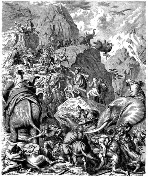 Между тем Ганнибал встретил при переходе через Альпы необыкновенные затруднения, совершая передвижение без надежных проводников по горам, покрытым снегом, в неблагоприятное время года (в конце октября) и имея при своей армии слонов, которые должны были чрезвычайно замедлять его следование.