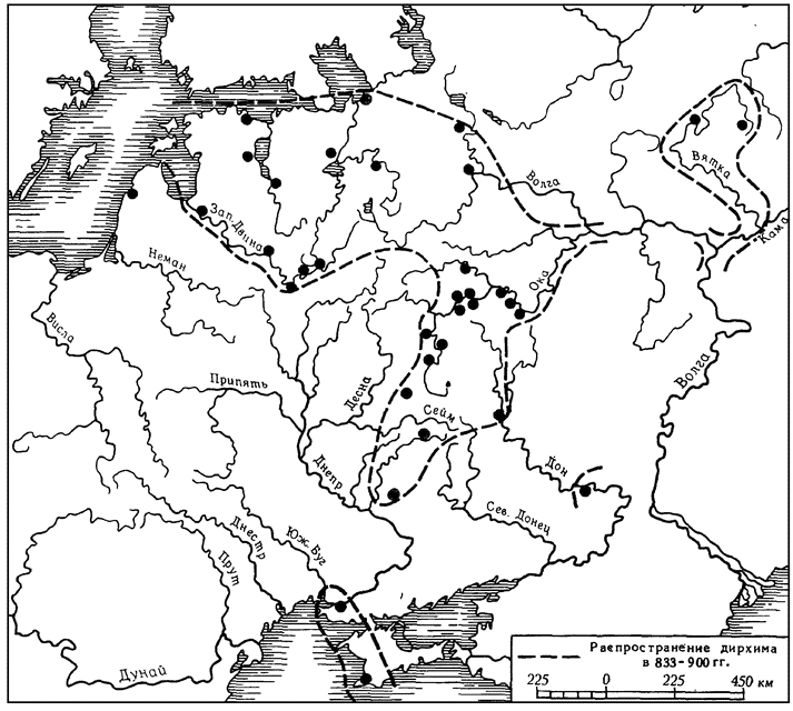 Вывоз дани. Внешняя торговля. По отношению к полюдью киевских князей середины X в. мы благодаря подробному рассказу Константина Багрянородного знаем не только процесс сбора дани, но и те грандиозные торгово-военные экспедиции, при посредстве которых осуществлялся сбыт русского полюдья в Византию; восточные авторы сообщают дополнительно о сбыте дани на восточных рынках. Картину сбыта дани знатью одного союза племен — Вятичей — приходится восстанавливать по разным отрывочным данным. На первом месте здесь данные нумизматики. В.Л. Янин привел в строгую систему все имеющиеся в науке сведения о кладах монет времени образования Киевской Руси. Основной вывод автора таков: «Становление торговых связей Восточной Европы со странами Халифата начинается в 70–80-х годах VIII в.». В другом месте В.Л. Янин делает более широкий вывод о торговле Европы вообще: «Европейско-арабская торговля возникает в конце VIII в. как торговля Восточной Европы со странами Халифата»; начало торговых связей арабов с обширным восточноевропейским рынком относится ко времени халифа Харуна ар-Рашида{165}. Большой интерес представляет серия нумизматических карт, отражающих распределение кладов в разные периоды, составленная В.Л. Яниным. Рассмотрим интересующую нас область Вятичей на этих общих картах Восточной Европы. Первая карта показывает распространение арабских дирхемов с конца VIII в. по 833 г.{166}