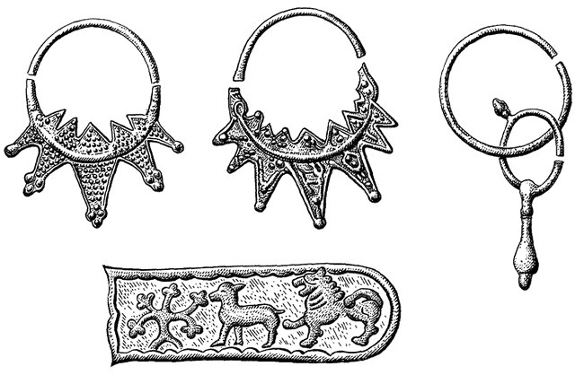 Кроме монетных кладов, представляют интерес и вещевые находки VIII–IX вв. восточного происхождения. Таков, например, клад вещей и монет из с. Железницы (близ Зарайска) с арабскими монетами VII–IX вв. (618–878 гг.). Среди вещей есть серебряные шейные гривны, серьги салтовского типа и серебряные височные кольца, которые можно счесть прототипом вятических и радимичских семилучевых и семилопастных височных колец, восточное происхождение образцов которых предугадывали еще археологи XIX в.{170}