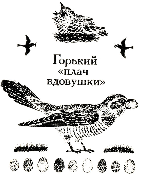 Одна из самых распространенных такая. Погубила жена своего мужа, и обратил ее бог в птицу, которой не суждено иметь своей семьи. Горько с тех пор плачет кукушка. Слезы ее превращаются в травку ("кукушкины слезки" - так и называется), а грустный голос ее слышен далеко вокруг. "Горемычная кукушка", "бедная вдовушка", - говорили о ней. И не знали сердобольные люди, что слышат они не плач, а весенний, брачный призыв, да к тому же не "вдовушки", а самца!