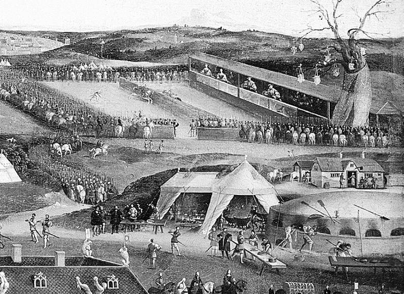 На обоих концах поля сооружены временные триумфальные арки. Со стороны Гина предусмотрено два защищенных места для монархов. Дерево чести можно увидеть из Ардра и от арки. На левой стороне поля – павильон королевы. Оттуда состязания будет наблюдать высокое дворянство. С правой стороны – трехэтажные трибуны для всех остальных. Генрих хотел, чтобы ров вырыли также и перед ними, чтобы исключить нежелательные вторжения на ристалище, но это могло повредить и без того шатким опорам строения. Поэтому решили ограничиться дополнительным рядом перил. В центре поля задрапированные тканью стены создают наклон. Такие стены появились только в конце XV века. Они призваны обеспечить бо?льшую точность и аккуратность рыцарей во время состязания, что в свою очередь позволяет уменьшить количество травм. Дополнительные перила помогают лошадям двигаться исключительно по прямой. Около полудня на поле появляются королевы Клод и Екатерина. За ними следуют Генрих и Франциск во главе своих команд тех, кто вызывает, и тех, кто принимает вызов, под предводительством герцога Аленкона и адмирала Бонниве. Затем последуют длинные церемонии с представлениями и поклонами. И только затем начнутся состязания.