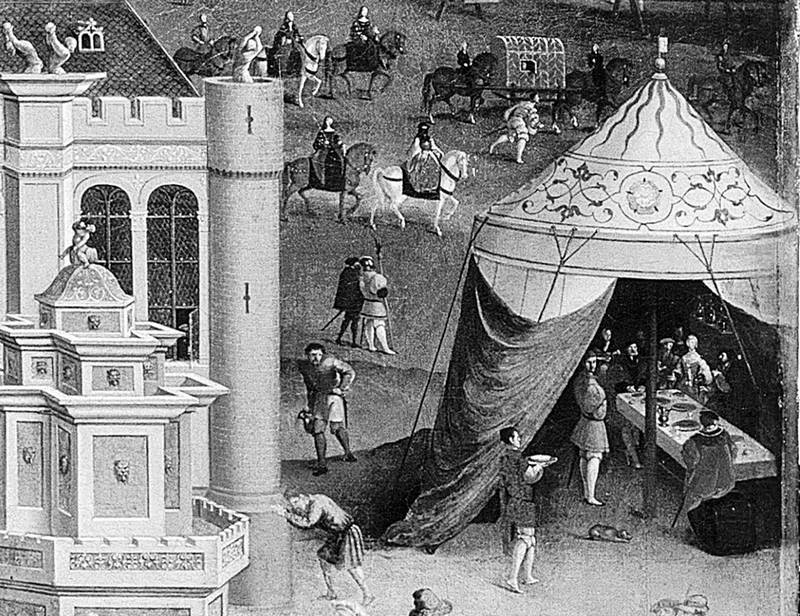 Примерно в полдень пушечный выстрел возвестит об отбытии Генриха из английского лагеря в сторону французского. В то же время Франциск собирается в английский лагерь. Они ненадолго встретятся в поле, прежде чем отправятся с визитом к королевам друг друга. Если вам удастся проникнуть на банкет, вы увидите, что у монархов своя зона, в которую нет доступа, в то время как остальная часть зала поделена на две свисающими с потолка гобеленами. С одной стороны обедают около сотни английских придворных дам. Там же присутствуют около двадцати джентльменов, которые, однако, ничего не едят. С другой стороны французское высокое дворянство в лице герцога Бурбона и адмирала Бонниве обедает со своей свитой. После обеда будут танцы под музыку барабанов, флейт и скрипок. Приглашенные звезды – группа короля Франциска, которая играет музыку в итальянском стиле на флейтах и тромбонах. Главное отличие этих танцев от обычных дворцовых маскарадов заключается в том, что танцующие могут вызывать себе партнеров по танцу из числа зрителей.